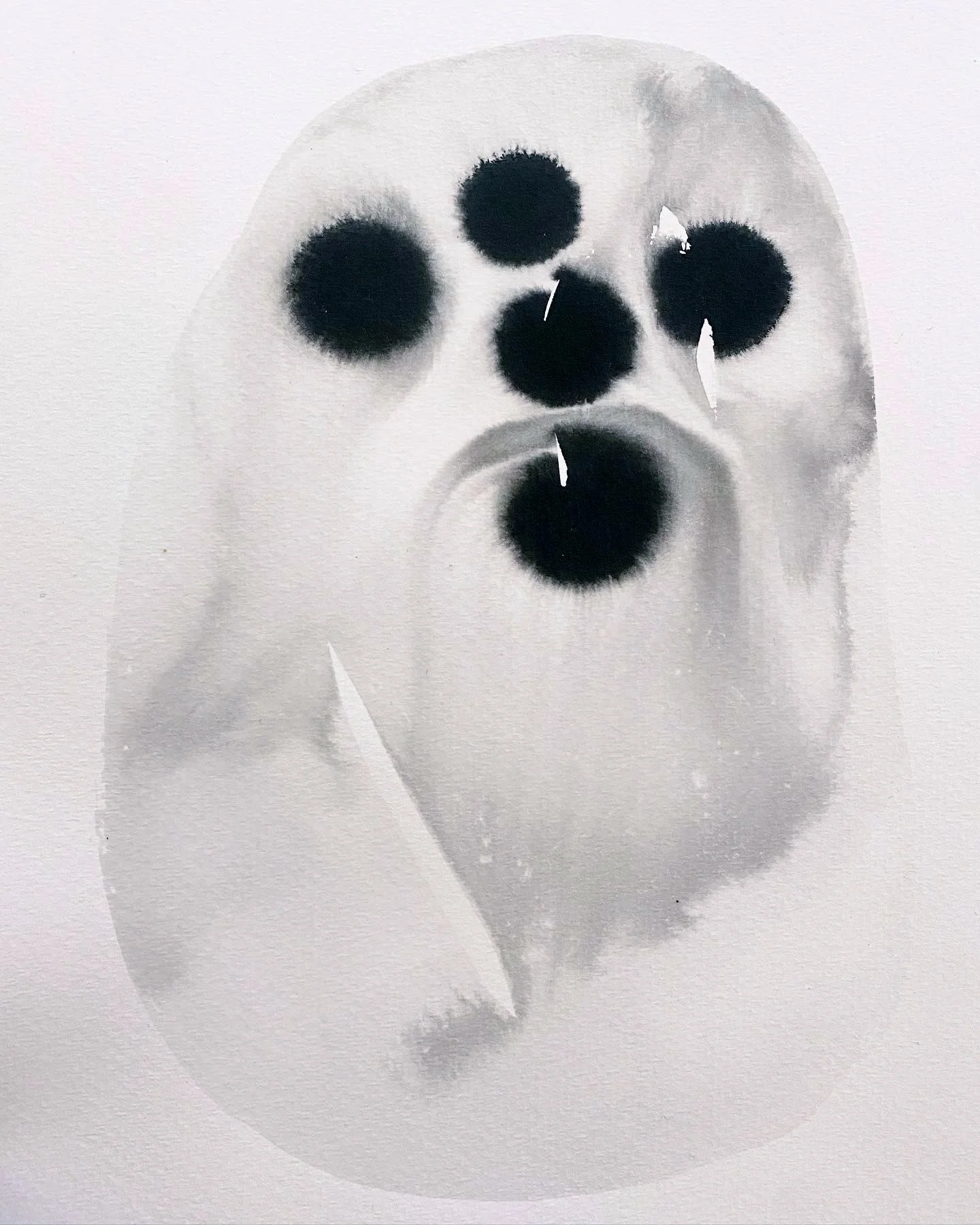 The rhythm of extraction and recycling underlies another work in the show: Hart’s series, “109 Dyewater Ink Drop Drawings.” With one drawing made for each mile of the Penobscot, the drawings combine waste ink used to color the beads in “Out in May Back by October,” recycled water from the bead-making process (much of it reclaimed from the air using a dehumidifier), and machine-made archival watercolor paper.